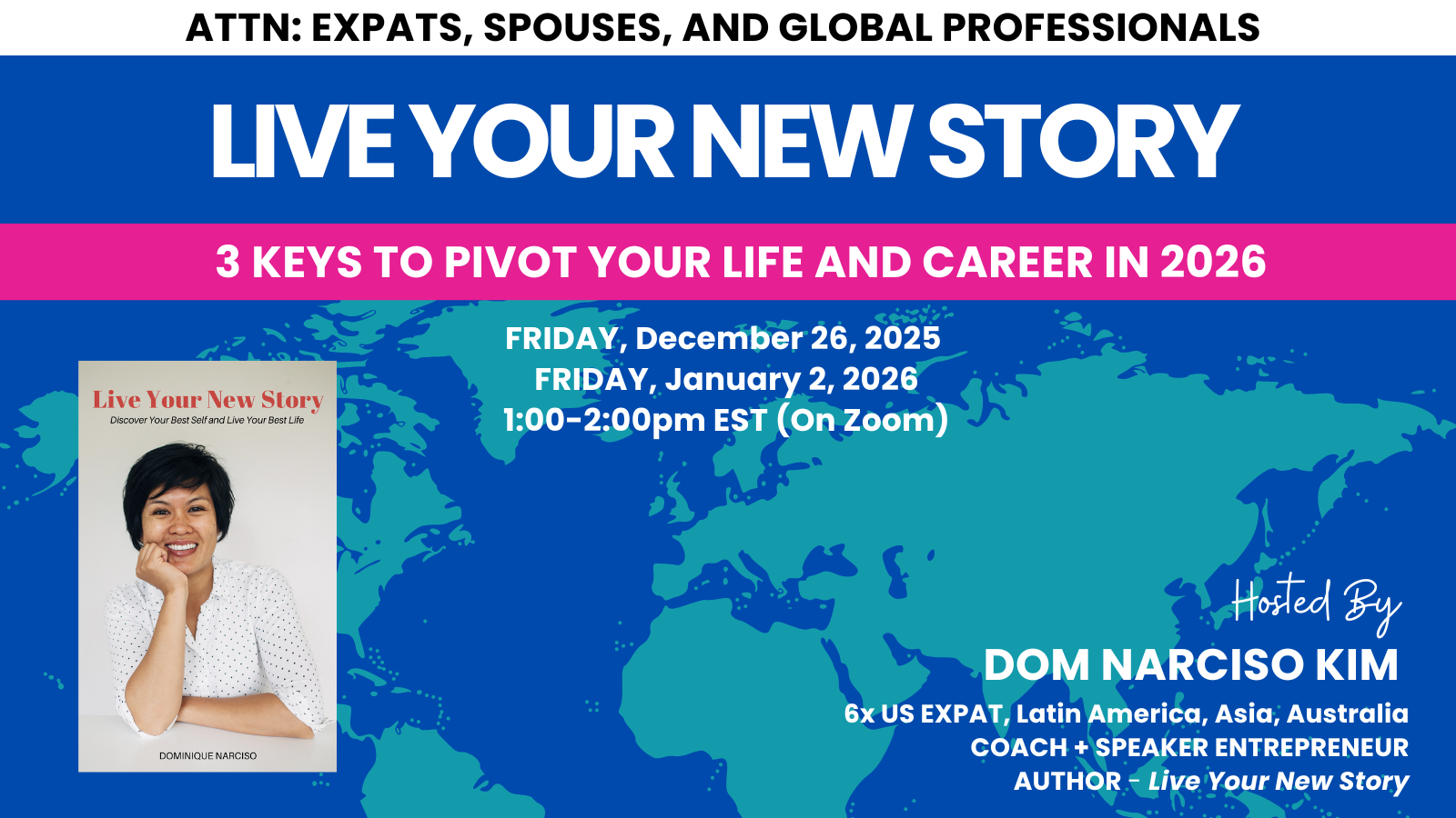 Dominique Narciso Kim is a 6x Expat, living in Costa Rica, Venezuela, Indonesia, Peru, South Korea, and Australia. Dom lost her identity as a trailing spouse for over a decade, experiencing unemployment, isolation, and loneliness. Through several life and career pivots, working in international aid and NGOs to US Embassies, Dom shifted her mindset, changed her actions, and built an adaptable identity that landed her in entrepreneurship as an inspirational coach, speaker, and author.Â